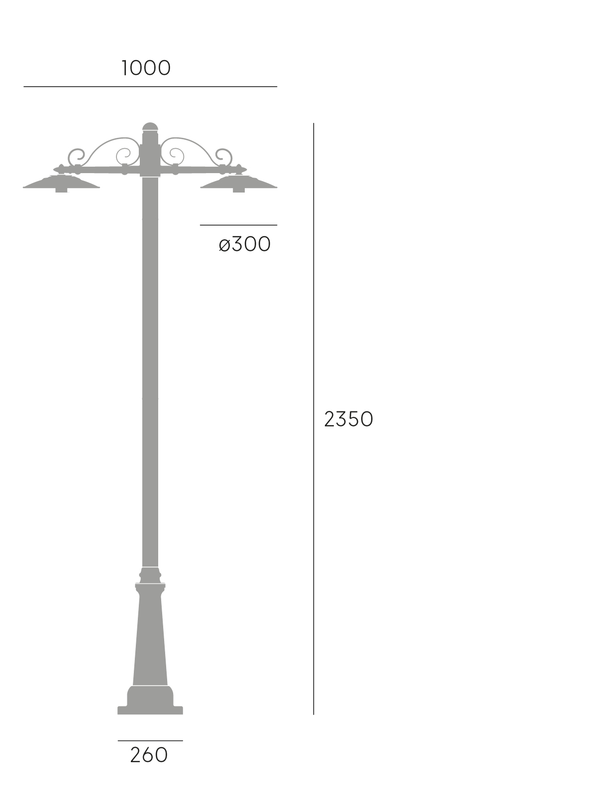 Il palo a due luci della serie ANTIQUE ha la struttura in alluminio pressofuso di alta qualità; il piatto anch’esso in alluminio pressofuso è verniciato nella parte superiore e smaltato bianco nella parte inferiore. Il portalampada è in ceramica di tipo E27 equipaggiato di guarnizione siliconica che inserita nell’apposito bicchiere copri-portalampada, consente al prodotto di raggiungere un grado di protezione pari a IP43. La minuteria in acciaio INOX. Questa variante è completa di triangolo di fissaggio a pavimento e dima. Nella confezione è presente una scatola contenente le istruzioni per il corretto montaggio, tasselli per il fissaggio. La verniciatura prettamente specifica per l'uso in esterno è garantita da trattamenti specifici appositamente studiati e testati nei nostri laboratori. Costruito secondo i criteri della normativa EN 60598-1 CE e successivi aggiornamenti.